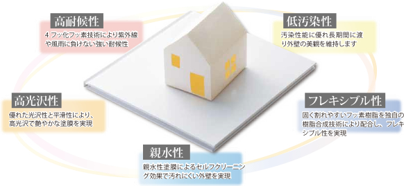 フッ素4Fは、建物を長期間に渡り守り続け、美しさを保つ建築用フッ素塗料の新基準です。